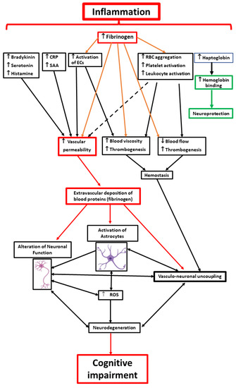 Schematic representation of the hypothesis of inflammation-induced vascular cognitive impairment. Among other factors that can affect vasculo-neuronal uncoupling, the factor that stands out is fibrinogen (Fg). It can be involved in changes of vascular permeability in various ways. Changes in vascular permeability result in direct activation of astrocytes and neurons through increased deposition of blood proteins (particularly of Fg) in the extravascular space, leading to neurodegeneration and a reduction in memory. Orange arrows indicate direct effects of Fg. Red arrows indicate direct effects. Dotted arrow indicates indirect effect. Green boxes and the arrow define anti-inflammatory pathway, while red boxes emphasize effects with strongest effects in VCID. Abbreviations: RBC—red blood cells, ECs—endothelial cells, CRP—C reactive protein, SAA—serum amyloid A, ROS—reactive oxygen species.