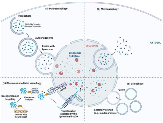 Autophagy plays a crucial role in recycling surplus or damaged components of cells, thereby sustaining homeostasis and survival. In autophagy, misfolded proteins and damaged organelles are taken into double-membrane vesicles known as autophagosomes for degradation via lysosomes. This process occurs under the physiological states, including cellular homeostasis, bioenergetic demands, and starvation through protein and organelle turnover. Autophagy can also occur in pathological conditions such as stress, pathogen infection, and other challenging stimuli. In cell starvation, autophagy removes misfolded proteins and deficient organelles, supplying nutrients for ATP synthesis to maintain the cell’s energy level and normal cellular function. However, under specific cellular and environmental conditions, autophagy may also result in cell death through the unregulated degradation of cellular compartments [2,3]. The four major types of autophagy are macroautophagy, microautophagy, chaperone-mediated autophagy, and crinophagy [4,5] (Figure 1).