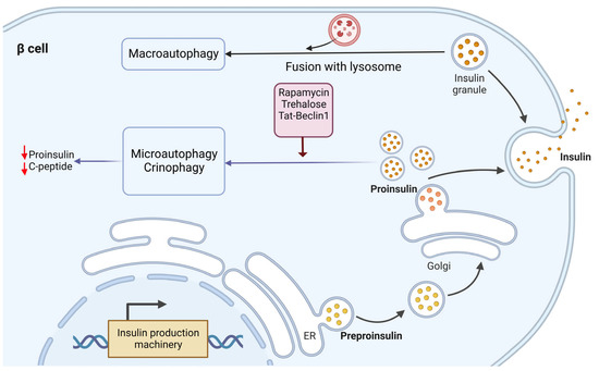 Investigation of the degradation mechanism behind insulin and its precursor (proinsulin) revealed a difference. While proinsulin is mainly degraded via the macroautophagy mechanism, microautophagy and crinophagy are involved in insulin granule degradation [27] (Figure 3). Recent studies showed that fasting situations guarantee low insulin secretion to avoid hypoglycemia through the cleavage of insulin granules [31]. In this regard, treatments for fasting and high glucose levels resulted in insulin secretion upon Tat-beclin-1-induced autophagy [27]. However, the related mechanisms are unknown and thus need to be studied further. While another study showed that in the presence of high glucose, the rate of autophagic flux in β cells is high, so suppression of autophagy is not applicable [27].