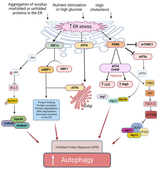 The ER in β cells has various functions, including producing, processing, and transporting proteins and lipids. During nutrient stimulation and to respond to the increased demand for a sufficient supply of insulin, β cells are forced to significantly enhance their protein synthesis capacity, which imposes a significant burden on the ER. In other words, high glucose level and aggregation of surplus misfolded or unfolded proteins in the ER causes ER stress. The induction of ER stress may present a protective (induction of autophagy) or a cytotoxic (activating apoptosis) mechanism. ER stress can induce the unfolded protein response (UPR) pathway [45]. UPR is an adaptive protective mechanism against ER stress, which prevents cell death by reducing protein misfolding and its outcomes. Three transmembrane sensors in the ER are involved in the regulatory roles of UPR, including protein kinase-like ER kinase (PERK), activating transcription factor 6 (ATF6), and inositol-requiring enzyme 1α (IRE1α) [45] (Figure 4). Indeed, all three pathways of the UPR regulate autophagy. During ER stress, eukaryotic translation initiation factor 2α (eIF2α) is inactivated by PERK. The outcome of this action will be the inhibition of protein translation and a decrease in ER workload [46]. In addition, the activated IRE1α generates an active transcription factor known as splid XBP-1 (sXBP1) by cleaving X-box binding protein 1 (XBP1) transcript [47]. Moreover, IRE1α induces decreased ER workload [48] through insulin mRNAs in β cells [49], thereby reducing the number of proteins in the ER. Simultaneously, the ATF6 protein is activated by translocation into the Golgi [50]. The active forms of sXBP1 and ATF6 (ATF6N) are essential for the upregulation of many target genes that contribute to protein folding, secretion, and ER-related protein degradation [51] to ameliorate ER size and function to reduce ER stress and inhibit cell death [47,50]. Therefore, autophagy activation under ER stress seems to be mediated by the three mentioned signaling pathways: IRE1a/JNK [15], PERK/eIF2a [16], and AKT/mTOR signaling pathway [17]. IRE1α -Xbp1 and PERK-eIF2α pathways can directly induce the expression of autophagic components [52,53,54] (Figure 4). Furthermore, IRE1α can also agitate autophagosome formation by phosphorylating Beclin-2 via JNK activation [55]. In addition, PERK may induce autophagy by inhibiting mTORC1 in the CHOP-Trib3 axis [56]. Additionally, the unphosphorylated PERK (uPERK) is activated under hypoxic conditions, which then upregulates the LC3 and Atg5 through the activating transcription factor 4 (ATF4) and C/EBP homologous protein (CHOP) molecules leading to enhanced autophagy [52] (Figure 4).