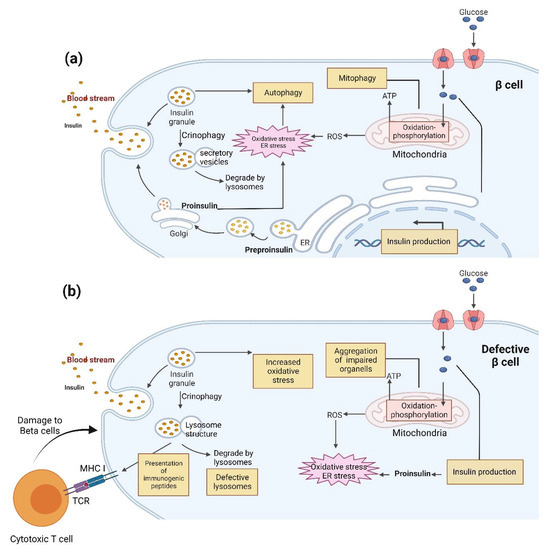 The possible role of autophagy (crinophagy) in insulin production, physiological conditions, and the pathological onset of T1D. (a) Glucose metabolism in the mitochondria generates ATP and ROS, which are two important insulin production and secretion stimulators. Hyperglycemia can lead to excessive ROS levels, leading to oxidative stress and the increased burden of chronically high levels of insulin secretion on the ER, resulting in ER stress and oxidative stress, which autophagy can alleviate to protect the β cells against apoptosis. As an alternative, it may be possible that stimulated crinophagy leads to direct insulin granules fusion to lysosomes instead of autophagy. In the physiological condition, protein degradation generated peptides tailored in the ideal length for binding to MHC-I and recognized as self and tolerated. This occurs through the ubiquitin/proteasome system or alternative processes such as autophagy. (b) In the early stages of T1D pathogenesis, environmental factors can cause the breakdown of self-proteins to target β cells. Autoantigens are trimmed to modified peptides in β cells and loaded into MHC-I molecules. The pMHCI reaches the progenitor membrane and is recognized by the TCR on CD8 + T cells, causing T cell activation and eventually insulitis.