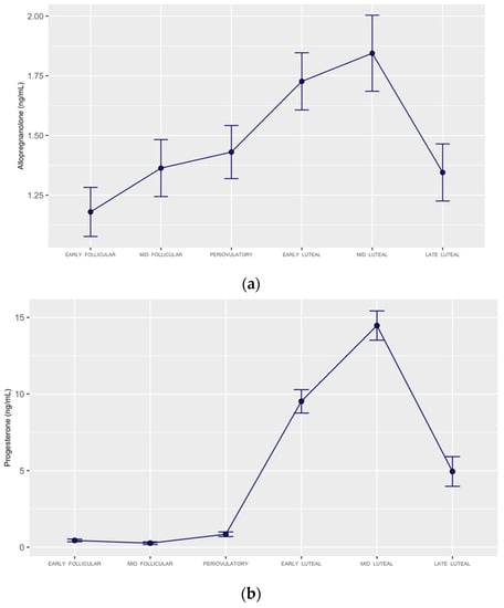 A detailed description of the study is published in [21]. In summary, we enrolled reproductive-age women to participate in the Premenstrual Hormonal and Affective State Evaluation (PHASE) project, which contains two sub-studies; attendance at eight menstrual-cycle clinic visits across the menstrual cycle, and participation in the Trier social stress test in the mid-late luteal subphase of the menstrual cycle. The present publication summarizes allopregnanolone and progesterone data from the eight clinic visits. PHASE is a registered clinicaltrials.gov (accessed on 9 February 2023) study (NCT03862469).