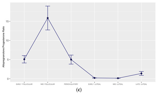 Allopregnanolone (a), progesterone (b), and allopregnanolone:progesterone ratio (c) mean and variance (SEM; presented as error bars) at each of the six subphases of the menstrual cycle.