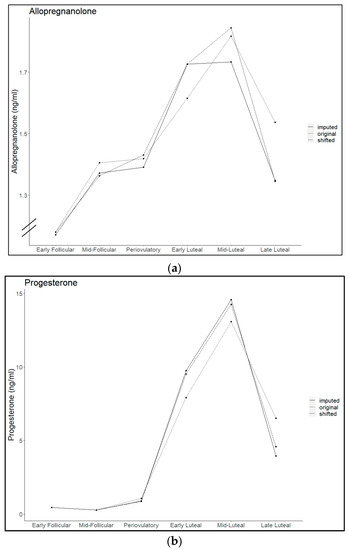 We present the trajectory of allopregnanolone, progesterone, and the ratio as mean and variance at each of the six menstrual cycle subphases in Figure 2a–c, respectively. Results of FDR-corrected pairwise comparisons of the imputed dataset across all the timepoints showed that there were significant differences in allopregnanolone levels between (1) early follicular and early luteal (t-statistic = −4.157; p ≤ 0.01), (2) early follicular and mid-luteal (t-statistic = −4.257; p ≤ 0.01), (3) mid-follicular and mid-luteal (t-statistic = −2.992; p ≤ 0.05), (4) periovulatory and mid-luteal (t-statistic = −2.502; p ≤ 0.05), and (5) mid-luteal and late luteal (t-statistic = 3.704; p ≤ 0.05) (Table 2). These five differences, and no additional ones, were also detected as statistically significant in the realigned data pairwise comparisons (Table 2). Figure 3a shows the original, realigned, and imputed allopregnanolone trajectories across the menstrual cycle. Results of FDR-corrected pairwise comparisons for progesterone are presented in Table S3, and visually depicted in Figure 3b.