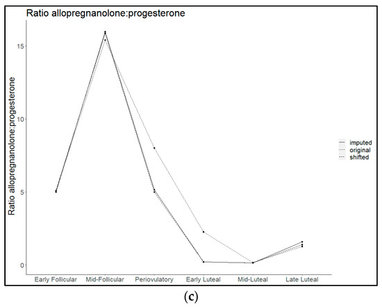 Circulating mean concentration changes for allopregnanolone (a), progesterone (b), and allopregnanolone: progesterone ratio (c) across the menstrual cycle from the original, shifted (realigned), and imputed datasets.