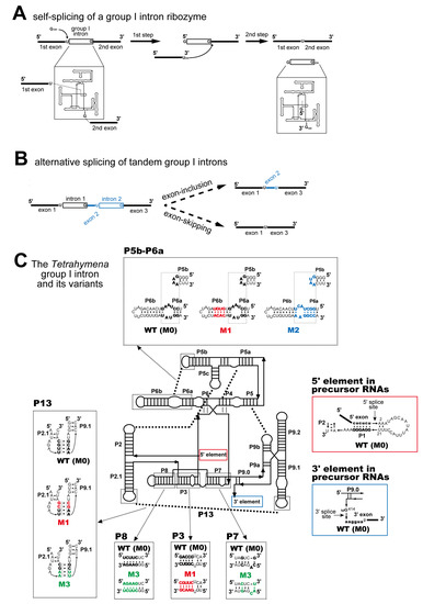 RNA splicing is a major class of processing events of primary transcripts synthesized via transcription of the corresponding DNA sequences. Primary transcripts commonly contain introns that must be removed in order to preserve their coding functions as messenger RNAs (mRNAs) or noncoding RNAs. In RNA splicing, introns are removed from the primary transcripts and the remaining RNA sequences (called exons) are joined together to yield mature transcripts. Introns in primary transcripts of eukaryotic nuclear protein-coding genes are recognized and removed by a large ribonucleoprotein complex called the spliceosome, in which RNA components are responsible for its catalytic function [1,2,3]. In addition to introns in pre-mRNAs removed by the spliceosome (spliceosomal introns), two other classes of introns that can remove themselves in an autocatalytic manner without trans-acting enzymes were identified [4,5,6,7]. This type of splicing is called self-splicing, and it is performed by the enzyme-like ability of intron RNA sequences (self-splicing introns). Self-splicing introns are classified into two groups designated as group I and group II introns [4,5,6,7]. Although their structures are quite different, the catalytic domain and splicing mechanism of group II introns share similarities with those of the spliceosome [8]. The spliceosome and group II introns have been proposed to have evolved from a common ancestral self-splicing intron resembling current group II introns [8]. Group I introns are considered to have evolved independently from group II introns and the spliceosome. The structure and function of group I introns have been studied extensively as the Tetrahymena thermophila group I intron (Tetrahymena intron, Figure 1) was the first RNA enzyme to be discovered [9,10], and it was shown to exhibit an excellent catalytic ability supported by its complex tertiary structure [11,12].