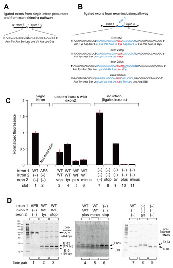 Figure 2. Splicing patterns of precursor RNAs possessing two Tetrahymena introns. (A) Ligated exons from single-intron precursors and exon-skipping splicing. The corresponding amino acid sequence is also shown. (B) Ligated exons from exon-inclusion splicing. Four exon 2 sequences were used in this study. The corresponding amino acid sequences are also shown. (C) β-Galactosidase reporter gene assays to evaluate the splicing activities of the precursors with a single WT or ∆P5 intron and four precursors with two introns and a short exon (exon 2) in E. coli. Expression of the lacZ-α fragment was also measured from the ligated exons without or with exon 2. (D) RT-PCR assays to distinguish the ligated exons (E123 or E13) including or skipping exon 2, with lengths of 174 and 150 bp, respectively. As the ∆P5 mutant was splicing-deficient in E. coli, the RT-PCR product corresponded to the precursor RNA.