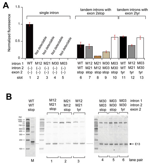 To further examine the occurrence of exon-inclusion splicing of these four variants, we replaced exon 2stop of M12 and M03 variants with exon 2tyr. If exon-inclusion splicing also proceeded in these variants in parallel with exon-skipping, the replacement of their exon 2stop with exon 2tyr would increase the amount of the functional lacZ α-fragment and enzymatic activity. In the TokyoGreen-βGal assay, cell lysates with the variants of M12 and M03 bearing exon 2tyr exhibited no increase in their reporter fluorescence compared to those bearing exon 2stop (slots 7, 10, 12, and 13 in Figure 4A). This observation further supported the suppression of exon-inclusion splicing in the precursor RNAs possessing a pair of chimeric-intron ribozymes and was also consistent with the results of the RT-PCR analysis (lane pairs 3 and 6 in Figure 4B).