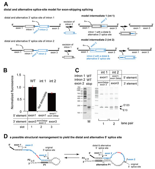 Figure 6. Distal and alternative splice sites induce exon-skipping splicing. (A) Schematic representations of distal and alternative splice-site models for exon-skipping splicing. (B) β-Galactosidase reporter gene assays of model intermediates to evaluate their use of distal and alternative splice sites to yield the ligated exons lacking exon 2 in E. coli. (C) RT-PCR assays to distinguish the ligated exons (E123 or E13) including or skipping exon 2, with lengths of 174 and 150 bp, respectively. (D) A possible structural rearrangement to yield the distal and alternative 5′ splice site.