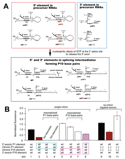 Figure 7. Rational engineering of the 5′ and 3′ splice sites to distinguish two introns. (A) The 5′ and 3′ elements of the WT intron ribozyme and its variants are shown in red and blue boxes, respectively. P10 base pairs formed in splicing intermediates by their 5′ and 3′ elements are shown in the black box. (B) β-Galactosidase reporter gene assays to evaluate the splicing activities of eight precursors with single introns possessing the WT and variant P1 and P10 elements. Expression of the lacZ-α fragment from the ligated exons yielded by variant P1 and P10 elements was also measured.