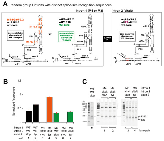 Based on the results for single intron constructs, we then constructed and examined tandem introns by combining the altP1P10 variant and the M4 or M3 intron variant. The M4 variant altered P9.2 and P9a elements but caused no alternations in the core elements of the intron ribozyme (Figure 8A) [28]. The ribozyme activity of the M4 variant was shown to be close to that of the WT intron in vitro and also in E. coli. In the tandem introns consisting of the M4 variant and the altP1altP10 variant, four elements involved in the splice site recognition (P1, P10, P9a, and P9.2) were all different between the first intron (M4) and second intron (altP1altP10) (Figure 8A). The cell lysate containing the tandem introns of the M4 variant and the altP1P10 variants (abbreviated as altalt in Figure 8B,C) flanking exon 2stop showed no fluorescence (slot 3 in Figure 8B), suggesting that the differentiation of the splice site recognition elements sufficiently suppressed exon-skipping splicing. The RT-PCR analysis also supported the exclusive occurrence of exon-inclusion splicing (lane pair 1 in Figure 8C and Figure S8). When we replaced exon 2stop with exon 2tyr, the cell lysate containing the tandem introns of the M4 variant and the altP1altP10 variants showed β-galactosidase activity in the TokyoGreen-βGal assay (slot 4 in Figure 8B) with no changes in the band pattern of the RT-PCR assay (lane pair 2 in Figure 8C). These results further supported the selective occurrence of exon-inclusion splicing. Exon-skipping splicing observed in M3–M0 (tandem introns of M3 and WT) was suppressed nearly completely through the replacement of the WT intron with the altP1altP10 variant (slot 6 in Figure 8B and lane pair 3 in Figure 8C), and the recovery of the β-galactosidase activity was also observed through the substitution of exon 2stop with exon 2tyr (slot 7 in Figure 8B) with no changes in the band pattern of the RT-PCR assay (lane pair 4 in Figure 8C). These results indicated that the differentiation of splice site recognition elements is an evolutionally effective approach to select the exclusive exon-inclusion splicing pattern.