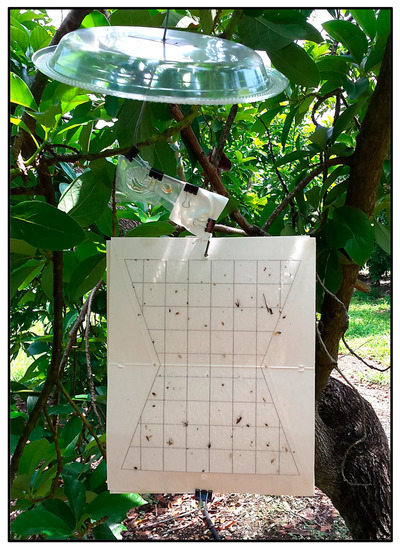 Trap design (Figure 1) consisted of two white sticky panels (23 cm × 28 cm, Scentry wing trap bottoms; Great Lakes IPM, Vestaburg, MI, USA) suspended back to back from the end of an S-shaped wire hook. Panels were secured along the bottom edge with a binder clip, and the lures/repellent dispensers were clipped to the wire hook above the sticky panels. The final assembly was covered with an inverted clear plastic plate (24 cm diameter) to protect bubble dispensers from rain. Previous field evaluations have shown this sticky trap design to be more effective than conventional Lindgren funnel traps for detection of E. perbrevis [35].