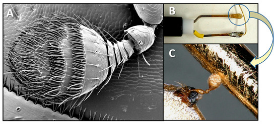 Antenna of female Euwallacea perbrevis. (A) Scanning electron micrograph; credit: Gary Bauchan, USDA-ARS. (B) Two-pronged EAG antennal holder modified with gold wire to accommodate the small antenna of E. perbrevis, mounted within the circled region. (C) Magnified region from panel B to show antennal preparation used for EAG recordings.