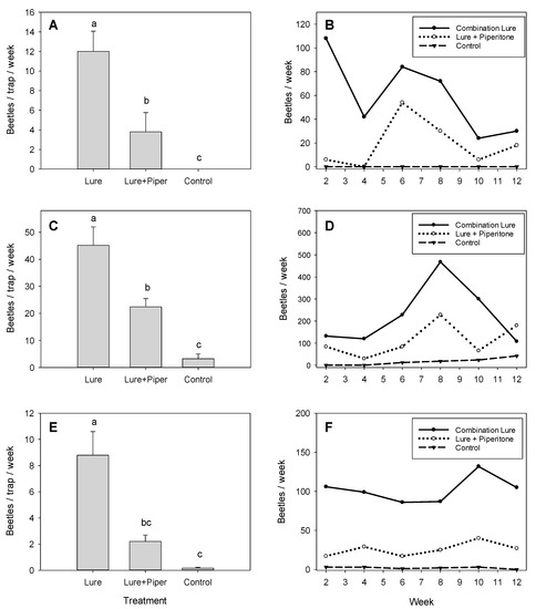 Likewise, in field test 3 (Figure 3E), there were significant differences in beetle captures among treatments (F = 17.423; df = 212; p < 0.001). Consistent with tests 1 and 2, traps baited with the lure plus piperitone caught significantly fewer beetles than traps baited with lure alone. However, these low numbers with piperitone were not significantly different than those obtained with the non-baited control traps. Presence of piperitone achieved a reduction in captures of 73.05 ± 4.70%, and in this field test the decrease in captures was significant up through week 12 (t = 3.277, df = 4, p = 0.015) (Figure 3F).
