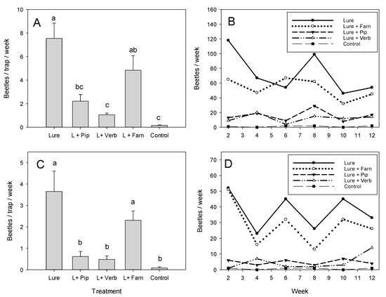 Similar to field test 4, overall trap captures in field test 5 were lower than those in field tests 1–3. In test 5 (Figure 4C), there were significant differences in mean captures of E. perbrevis among treatments (F = 6.714; df = 420; p = 0.001). Consistent with test 4, traps baited with the combination lure alone or the lure plus α-farnesene captured the highest numbers of beetles. Trap captures with the lure plus piperitone or the lure plus verbenone were significantly lower than both the lure alone or lure plus α-farnesene, and equivalent to the random captures obtained with the non-baited control. Presence of piperitone resulted in a reduction in captures of 84.70 ± 2.73%; presence of verbenone decreased captures by 86.07 ± 1.66%. As observed in field test 4, analysis of weekly captures (Figure 4D) indicated that the reduction in captures with piperitone was significant up through week 12 (t = 4.143, df = 8, p = 0.003). However, the repellent effect of verbenone was significant at week 10 (t = 7.203, df = 8, p < 0.001) but not at week 12 (t = 2.116, df = 8, p = 0.067).