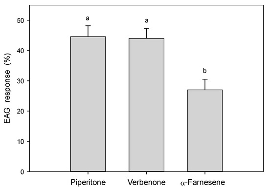 In the EAG experiment (Figure 5), there were differences in mean olfactory response among treatments (F = 8.177; df = 233; p = 0.001). Volatile emissions from the piperitone and verbenone dispensers elicited equivalent EAG responses, and both were significantly higher than the response measured with emissions from the α-farnesene dispenser.