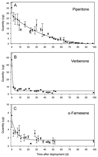 Volatile emissions from the piperitone dispenser (Figure 6A) decreased steadily for 12 weeks after field exposure, at which point the repellent was barely detectable. Piperitone emissions were best fit by the exponential decay model: y = −3.32 + 31.85e(−0.02x). In contrast, emissions from the verbenone dispenser (Figure 6B) decreased very rapidly during the first week of deployment, and then stabilized at a low but constant rate for the duration of the sampling period (99 days). Verbenone emissions were best fit by the exponential decay model: y = 4.47 + 42.38e(−1.02x). Emissions from the α-farnesene dispenser (Figure 6C) decreased rapidly during the initial two weeks of field exposure, and then, like verbenone, were maintained at a constant low release rate. Emissions of α-farnesene were best modeled by the exponential decay equation: y = 1.42 + 4.77e(−0.16x). (Note: Due to a federal government shut down and employee furlough, there was a gap in data collection for emissions from the verbenone and α-farnesene dispensers.)