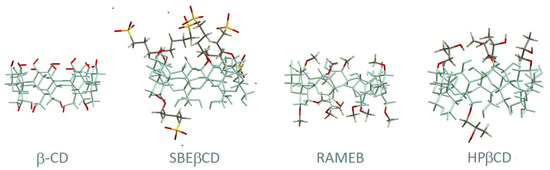 Figure 1. Schematic depiction of the structure of β-CD and its derivatives of pharmaceutical use. The hydroxyl groups located at the rims of β-CD, highlighted in red, serve as anchoring sites for chemical functionalisation. In the derivatives, only the functional groups (hydroxypropyl, sulphobutylether and methoxyl) are highlighted with colour. Adapted from Braga et al. [9] under a Creative Commons licence (CC BY 4.0).
