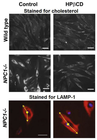 Figure 2. Immunostaining micrographs of healthy fibroblasts (wild type) and fibroblasts from a Niemann–Pick patient (NPC1−/−); scale bar = 50 μm. Top and middle rows show the distribution of cholesterol (in white, stained with filipin). Bottom row shows LAMP-1 distribution (in red, a lysosome marker) along with the cell nuclei (in blue). The arrow represents the distribution of LAMP-1 from the centre of the nuclei, depicting that the LAMP-1 protein is mostly confined to the area near the nuclear envelope in control NPC1−/− cells and distributed more widely throughout the cytoplasm when cells were treated with HPβCD. Cells were incubated with 1 mm HPβCD for 72 h prior to image collection. Images are a representative of at least three random fields of three experimental replicates. Adapted from Singhal et al. [45] under a Creative Commons licence (CC BY 4.0).