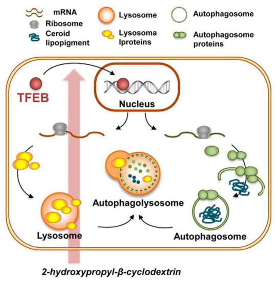 Figure 3. Schematic representation of the proposed adaptive cellular response to HPβCD treatment. HPβCD administration increases expression of the transcription factor EB (TFEB) in the cytoplasmatic ribosomes. Upon translocation from the cytoplasm to the nucleus, TFEB regulates the expression of genes involved in biogenesis and fusion of lysosomes and autophagosomes. As a result, HPβCD administration results in enhanced clearance of the autophagic substrate ceroid lipopigment in the cells of patients with congenital deficient elimination of this substance. Reproduced from Sarkar et al. [47] under a Creative Commons licence (CC-BY-NC-ND 3.0).