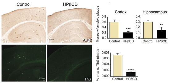 Figure 4. HPβCD treatment significantly reduces amyloid plaque burden in Tg19959 mice at four months of age. Top row: representative images of amyloid plaques detected with an Aβ42 antibody, along with the calculated percentage of area covered by amyloid plaques in cerebral cortex and hippocampus of Tg19959 mice treated with saline (control) or HPβCD. Bottom row: representative images of amyloid plaques stained with thioflavin (ThS), a fluorescent stain that binds to beta-sheet rich regions of amyloid plate. The chart depicts the percentage of brain tissue area covered by ThS-positive plaques. **, p < 0.01; ***, p < 0.001; ****, p < 0.0001; n = 9–10 in each group. All results were obtained and analysed from two separate animal studies. Reproduced from Yao et al. [65] under a Creative Commons licence (CC BY-NC-SA 3.0).