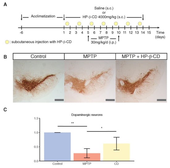 Figure 5. Treatment with HPβCD (represented as HP-β-CD in this figure) protects against toxicity of MPTP. (A) Treatment scheme for the generation of MPTP-induced subacute Parkinson’s disease mice model and subsequent treatment with HPβCD. (B) Representative mouse midbrain sections stained for tyrosine hydroxylase (TH) in control, MPTP or HPβCD-treated mice (bar = 400 μm). (C) Stereological quantification of the TH levels in mouse sections normalised to control levels. Statistical analysis was performed using Kruskal–Wallis and Dunn’s tests for selected comparisons. * p < 0.05, ** p < 0.01. Reproduced from Jarazo et al. [77] under a Creative Commons Licence (CC BY 4.0).
