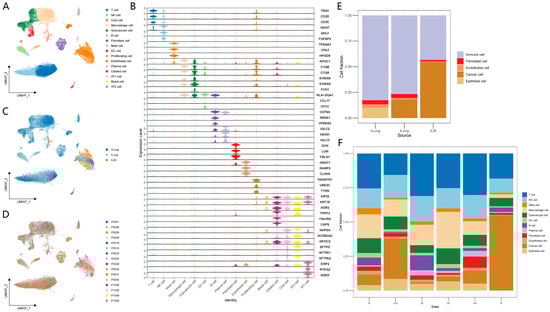 A single-cell atlas of nLung, tLung and tL/B. (A) The UMAP plot of high-quality cells to visualize cell-type clusters. (B) Stacked violin plots displaying markers of the expression across sixteen cell types. (C,D) The UMAP plot cell distribution in tissue source and patient source. (E,F) Proportion of cells in nLung, tLung and tL/B and different stages (IA, IA3, IB, IIA, IIIA, and IV).