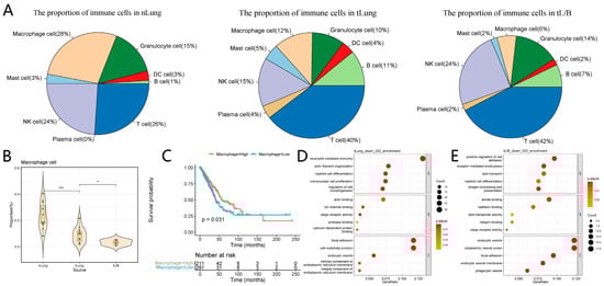 Biological function of a macrophage cell and its impact on patient survival. (A) Immune cell composition in nLung, tLung, and tL/B. (B) Box plot of the cell percentage of macrophage cells in the three sources: distant normal tissue (nLung), early LUAD (tLung), and advanced LUAD (tL/B). * p adjusted < 0.05, and *** p adjusted < 0.001 (t.test). (C) Correlation between the proportion of macrophages with survival rate; orange represents high ratios and green represents low ratios, (p = 0.031). (D,E) The GO function enrichment analysis results of downregulated genes of the early LUAD (tLung) (distant normal tissue (nLung) as the control), and downregulated genes of the advanced LUAD (tL/B) (early LUAD (tLung) as the control), p adjust < 0.05.