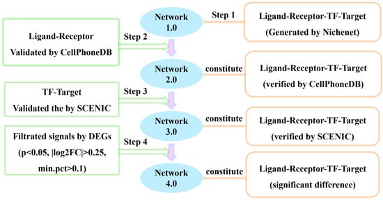 Macrophages exhibit strong plasticity and functional heterogeneity, and their phenotypic transformation is complex [48]. A recent study found that tumor cells can alter the macrophage phenotype. To further investigate which molecules of tumor cells might mediate the change in macrophage cells, we constructed the gene regulatory network comprised of four elements: ligand-receptor-transcription factor (TF)-target. Gene regulatory networks were constructed in four steps (Figure 3). First, we applied Nichenet to obtain intercellular signal transduction networks and constructed ligand-receptor-TF-target links (Network 1.0); second, ligand-receptor (L-R) pairs of the gene regulatory network were verified by CellPhoneDB, the overlapping ligand-receptor pairs and their downstream signals were retained (Network 2.0); third, SCENIC was used to verify TF-target pairs of Network 2.0. The verified TF-targets of Network 2.0 were preserved (Network 3.0); fourth, differentially expressed genes (DEGs) were used to filter important signals of Network 3.0 (Network 4.0). After multiple screening of regulatory networks, the number of signaling molecules is reduced, which means that the resulting overlapped common filter, derived from multiple communication tool analyses, can reduce the false positive results with the use of a single tool.
