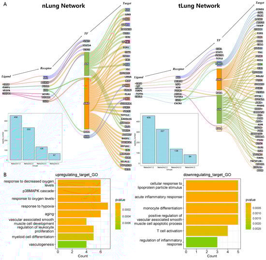 Changes in regulatory networks in nLung and tLung. (A) Gene regulatory network of distant normal tissue (nLung) and gene regulatory network of early-stage LUAD (tLung). The network consists of ligand-receptor-TF (transcription factor)-target. (B) The GO function enrichment analysis results of targets of tLung network.
