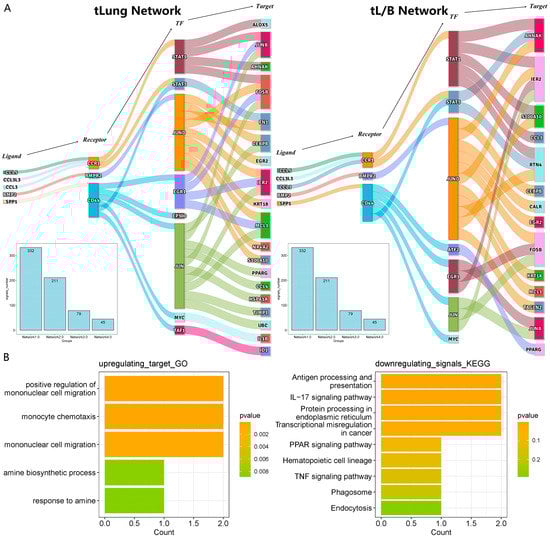 Changes in regulatory networks in tLung and tL/B. (A) Gene regulatory network of early-stage LUAD (tLung) and gene regulatory network of advanced-stage LUAD (tL/B). The network consists of ligand-receptor-TF (transcription factor)-target. (B) Left: the GO function enrichment analysis results of targets of tLung network. Right: the KEGG function enrichment analysis results of signals (receptor, TF, target) of tLung network.
