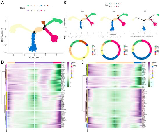Macrophage trajectory. (A) Pseudotrajectory of macrophages. (B) Pseudotrajectory of macrophages in source. (C) Proportion of macrophages in different states of the three sources (nLung, tLung, tL/B). (D) Heatmap shows the gene expression dynamics of branch 3 in the macrophage group. Genes (rows) of the gene regulatory network are clustered and cells (columns) are ordered according to the pseudotime development. (E) Heatmap shows the gene expression dynamics of branch 2 in the macrophage group. Genes (rows) of the gene regulatory network are clustered and cells (columns) are ordered according to the pseudotime development.