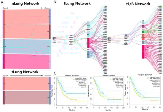 Validation of regulatory networks. (A) Gene regulatory network of distant normal tissue (nLung) and gene regulatory network of early-stage LUAD (tLung). (B) Gene regulatory network of early-stage LUAD (tLung) and gene regulatory network of advanced-stage LUAD (tL/B). (C) Kaplan-Meier estimates of overall survival from LUAD patients in TCGA based on ligands (VEGFA, TIMP1, SPP1).