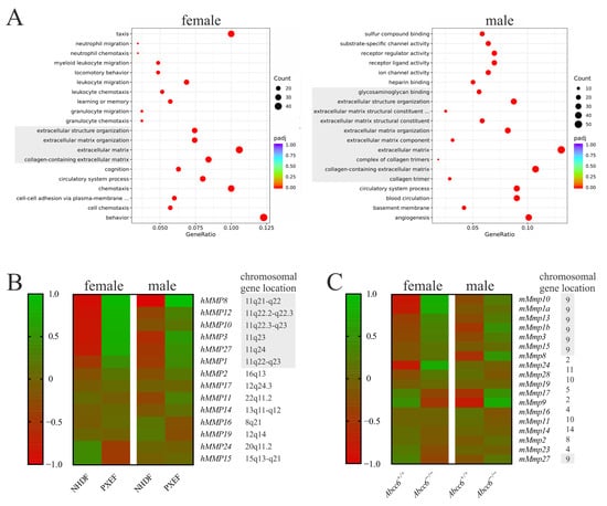 RNA sequencing data from human and murine fibroblasts with or without ABCC6 deficiency. (A) Differential expression pattern according to the gene ontology database in PXEFs compared to NHDFs assessed separately for female (NHDF n = 2, PXEF n = 2) and male cell lines (NHDF n = 2, PXEF n = 2). Entities directly associated with the extracellular matrix are greyed. (B) Heat map of the differential expression in female and male human NHDFs and PXEFs regarding MMPs plus the specification of the respective gen locus. A location on the gene cluster Chr11q21-24 is highlighted in grey. (C) Heat map of differential expression in murine Abcc6+/+ and Abcc6−/− fibroblasts from female (Abcc6+/+ n = 4, Abcc6−/− n = 4) and male (Abcc6+/+ n = 4, Abcc6−/− n = 4) animals regarding MMPs plus the specification of the respective gen locus. A location on the gene cluster Chr9 is highlighted in grey.