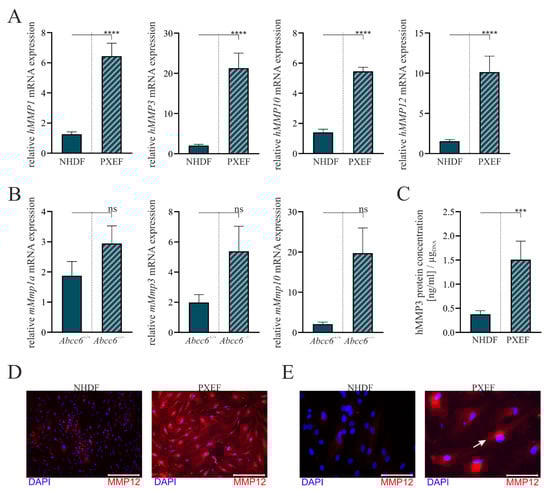 Subsequently, the mRNA expressional levels of the selected MMPs observed in the RNA sequencing data were validated via RT-qPCR. The selection was based on (a) the overall expression level, (b) the extent of differential expression between healthy and ABCC6-deficient fibroblasts and (c) the similarity in overexpression between female and male cell lines to summarize the results in a simplified way. Therefore, we defined the expressions of hMMP1, hMMP3, hMMP10 and hMMP12 for the human system and hMmp1a, hMmp3 and hMmp10 for the murine system as appropriate markers. hMMP3 and hMMP12 protein expression was determined using an ELISA or, respectively, immunofluorescent detection.