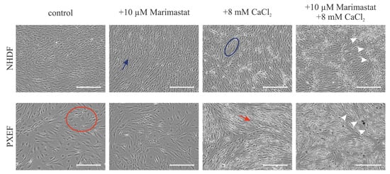 Representative bright-field microscopy pictures of NHDFs and PXEFs cultured for 21 days. Cultivation conditions included control treatment with DMSO, 10 µM Marimastat, 8 mM CaCl2 or a combination of 10 µM Marimastat and 8 mM CaCl2. Exemplary calcium deposits are highlighted with white arrows. The blue arrow points to an exemplary healthy fibroblast spindle-shape while the blue circle marks an exemplary healthy fibroblast with extended cytoplasm. The red circle surrounds an exemplary PXEF with a flat cell body whereas the red arrow points to a PXEF with an acquired spindle-shape. Scale bars: 400 µm.