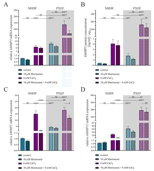The expression of MMPs in human dermal fibroblasts under separate or combined treatment with 10 µM Marimastat and 8 mM CaCl2 for 21 days. The NHDFs (n = 3) and PXEFs (n = 3, grey highlighted) were kept under the conditions specified for 21 days. (A) mRNA expressions of hMMP3, (C) hMMP1 and (D) hMMP12 were measured via RT-qPCR. (B) hMMP3 protein concentration in the cell culture supernatant of NHDFs (n = 3) and PXEFs (n = 3) was evaluated utilizing an ELISA and normalizing it to the DNA content in the cell layer. Data are shown as mean ± SEM. Mann–Whitney U test significance levels: not significant (ns), p < 0.05 (*), p < 0.01 (**), p < 0.001 (***), p < 0.0001 (****).
