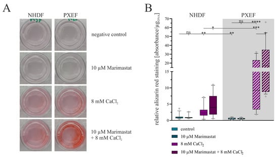 Evaluation of the calcification status in human fibroblasts concerning separate or combined treatment with 10 µM Marimastat and 8 mM CaCl2 for 21 days. The NHDFs (n = 3) and PXEFs (n = 3, grey highlighted) were kept under the conditions specified for 21 days. (A) Exemplary pictures of fibroblasts’ cell culture wells after ARS and (B) its quantification normalized to the DNA content in the cell layer and relative to the staining in control NHDFs. Data are shown as mean and boxes marking the 10–90 percentile. Mann–Whitney U test significance levels: not significant (ns), p < 0.05 (*), p < 0.001 (**), p < 0.001 (***), p < 0.0001 (****).