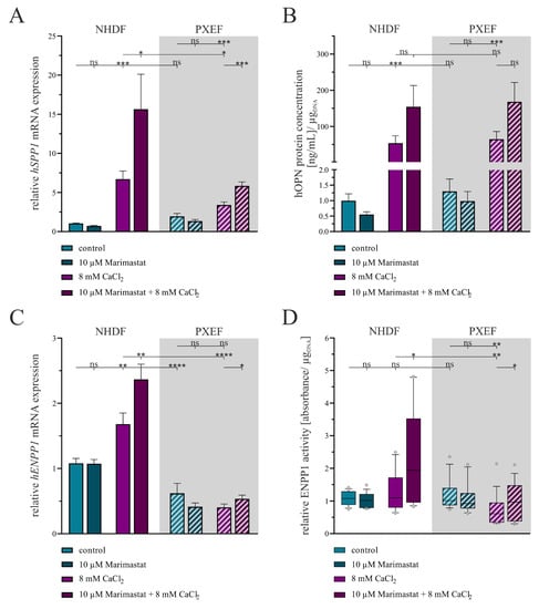 Evaluation of the calcification status in human fibroblasts concerning separate or combined treatment with 10 µM Marimastat and 8 mM CaCl2 for 21 days. The NHDFs (n = 3) and PXEFs (n = 3, grey highlighted) were kept under the conditions specified for 21 days. (A) Relative hSPP1 mRNA gene expression measured by RT-qPCR and (B) hOPN concentration in cell culture supernatant determined by ELISA and normalized to the DNA content in the cell layer. (C) Relative hENPP1 mRNA expression assessed by RT-qPCR and (D) ENPP1 activity in the cell culture supernatant normalized to the DNA content in the cell layer. (A–C) Data are shown as mean ± SEM or (D) as mean and boxes marking the 10–90 percentile. Mann–Whitney U test significance levels: not significant (ns), p < 0.05 (*), p < 0.001 (**), p < 0.001 (***), p < 0.0001 (****).