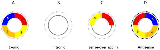 Structural categories of circRNAs. (A) Exonic circRNAs consist of only exons. (B) Intronic circRNAs consist of only introns. (C) Sense-overlapping circRNAs consist of exons and introns. (D) Antisense circRNAs are in strand direction antisense to their linear RNA counterparts. The exon numbers are for illustration only.