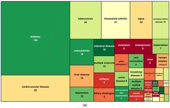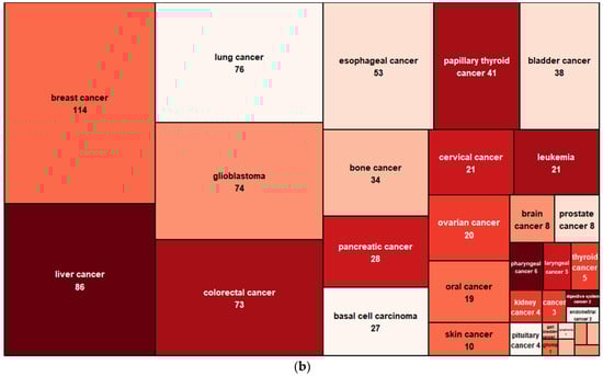 CircRNAs associated with noncancer (a) and cancer (b) diseases. Data are based on the CirCAD database [10].