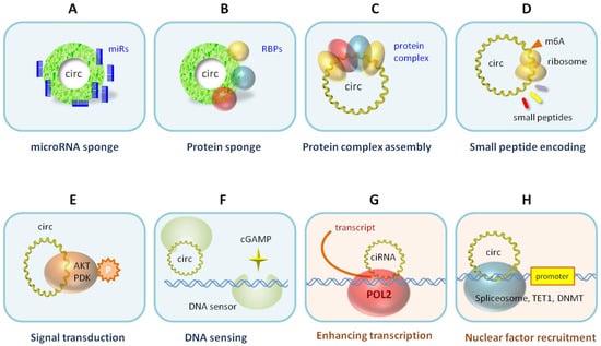 Beyond the microRNA sponge function (Figure 3A), surprising new circRNA molecular functions were discovered during the studies of differentially expressed circRNAs (Figure 3). Similar to miRNA sponging, circRNAs can bind proteins as RNA-binding protein (RBP) sponges (Figure 3B). There are several hundred RBPs that do a variety of biological functions, e.g., transcription, splicing, RNA processing, RNA transport, RNA localization, translation, RNA stability, and RNA modification. Over the years, circRNAs have been found to be involved in many of these RBP-related functions. CircRNAs can also be the guiding scaffold for protein complex assembly (Figure 3C). The circRNA and protein interactions have been cataloged in the circInteractome database [16,17]. Although circRNAs generally do not translate proteins due to the lack of the 5′ cap structure for translation initiation, some circRNAs can initiate protein or small peptide translation from the IRES or the internal m6A modification that recruits a translation initiation complex (Figure 3D). Some of these small peptides can be bioactive, e.g., as competing dominant negative inhibitors. Increasingly, circRNAs are found to interact with intracellular signaling molecules, e.g., AKT and PDK, to modulate signal transduction [18] (Figure 3E). Interestingly, the circRNA cia-cGAS can act as a DNA sensor switch to control the secondary messenger cyclic GAMP [19] (Figure 3F). In the nucleus, intronic circRNAs can tether RNA polymerase II to enhance the transcription [7] (Figure 3G), spliceosomes for splicing, or chromatin modifiers (e.g., TET1 and DNMTs) to epigenomically regulate gene expression (Figure 3H).