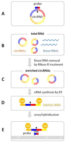 CircRNA microarray detection of circRNAs. (A) The array’s probe sequence spans the circular junction (arrow) of the circRNA. In the circRNA microarray workflow, total RNA (B) is treated with RNase R to selectively digest the linear RNAs so as to enrich the circRNAs (C). The circRNAs are copied by reverse transcriptase (RT) from the annealed random primers containing a T7 promoter. The cRNA is synthesized from the T7 promoter at the end of the cDNA template by in vitro T7 polymerase transcription, incorporating fluorescent Cy3-UTP (D). The fluorescent cRNA is hybridized to the probes printed on the array surface (E).
