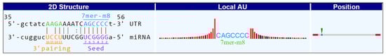 An example of circular RNA and its binding miRNA. The MRE type (7mer-m8), seed region, 3′ pairing, local AU, and position in the circRNA are displayed.
