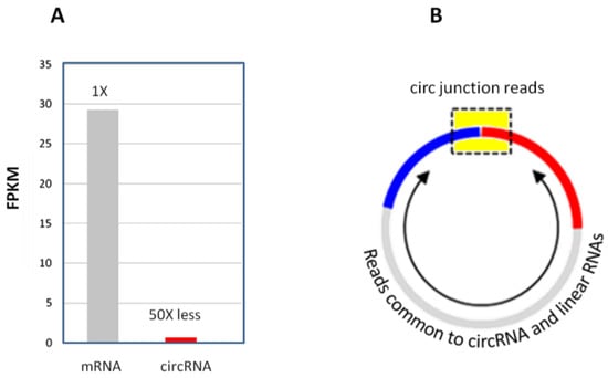 (A) CircRNA abundance relative to mRNA in total RNA. (B) Circular junction reads (in the yellow box region) only represent a small portion of the entire circRNA. The reads from other parts of the circRNA body (arrowed region) are indistinguishable from that of the linear RNA counterparts.