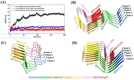 (A) The backbone RMSDs of α-Syn fibrils as a function of time in human brain (red), cofactor-tau (black), and cofactor-free (blue) systems. (B–D) show the 3D structures of the α-Syn fibrils in human brain (PDB ID: 6XYP), cofactor-tau (PDB ID: 7L7H), and cofactor-free (PDB ID: 6SST), respectively. The amino acid sequence is color-coded. The structures containing β-sheet are represented by β1–β7 in sequence.