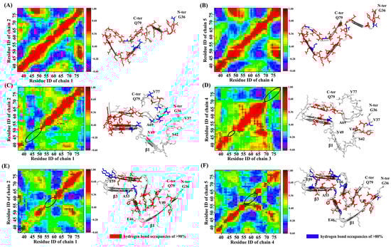 Analysis of DCCM (left) and backbone H-bond (right) in each system. (A,B) Chain-1/2 and Chain-4/5 in human brain system. (C,D) Chain-1/2 and Chain-3/4 in cofactor-tau system. (E,F) Chain-1/2 and Chain-4/5 in cofactor-free system. In DCCM analysis (left), the red region depicts a strong correlation between the residues, the blue region portrays a weak correlation and the black circles represent the possible initial dissociation sites. In H-bond analysis (right), red residues indicate the occupancy of hydrogen bond above 90%, blue residues above 80%, and white residues indicate weak H-bond interaction.