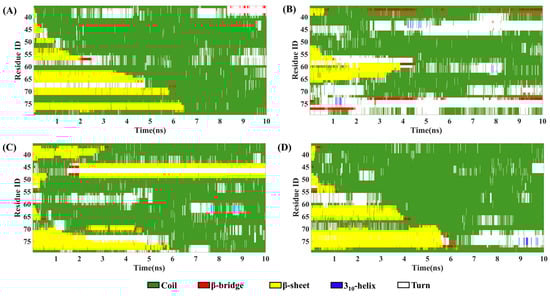 Changes in the secondary structure as a function of time. (A) Chain-1 in human brain system. (B) Chain-1 in cofactor-tau system. (C) Chain-1 in cofactor-free system for path1. (D) Chain-1 in cofactor-free system for path2.