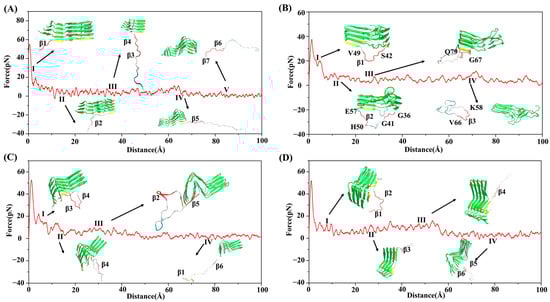 For the human brain system, the changes of secondary structure show that the β-sheet gradually transforms into a coil structure, and the transformation is complete at about 6.5 ns (Figure 3A). In addition, according to the change of the pulling force (Figure 4A), the whole dissociation process is roughly divided into five stages. The earliest dissociation region was residues 36–41 (contain β1, I), followed by the dissociation of residues 42–45 (contain β2, II). Subsequently, residues 46–57 (contain β3 and β4) dissociated in the third stage (III), followed by residues 58–66 (contain β5) in the fourth stage (IV). In addition, residues 67–79 (contain β6 and β7) dissociated in the fifth stage (V). It can be seen that the dissociation began at the N-terminal and proceeded sequentially to the C-terminal until the chain completely separated from the fibrils. For the cofactor-tau system, the complete conversion of β-sheet to the coil structure required a shorter time (about 4 ns) due to its lower β-sheet content (Figure 3B). The whole dissociation process can be divided into four stages (Figure 4B). The original dissociation sites were located at residues 42–49 (contain β1, I), which is consistent with the prediction in the CMD simulation. Next, the coil structures at N-terminal (residues 36–41) and residues 50–57 (contain β2) were dissociated (II). The third stage (III) was the dissociation of structures at the C-terminal (residues 67–79). Eventually, the remaining residues 58–66 (contain β3) dissociated from the fiber interface (IV).