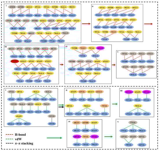 To further show the detailed changes in the residues’ interactions between boundary chains and fiber interfaces during dissociation, residue interaction network (RIN) analysis was performed based on the representative structure. Firstly, for the human brain system (Figure 5), the first stage was the dissociation of residues 36–41. At the same time, the H-bonds and van der Waals (vdW) interactions formed by these residues such as Val37 and Tyr39 (gray ovals in Figure 5-I) were destroyed. In addition, the π–π interaction between the Tyr39 residue pair was also destroyed, which indicates that Tyr39 was completely dissociated at this stage. Thereafter, the intermediate structure was stabilized by enhancing the H-bond interactions of Gly73 with Val71 and the vdW interactions of the Glu61, Val63, and Val74 residue pairs (pink ovals in Figure 5-II). However, these interactions were disrupted in the second dissociation stage (II), and the subsequent stabilization of the intermediate structure was achieved by increasing the vdW interactions between residues Val52 and Val55 (magenta ovals in Figure 5-III) as well as the H-bond interactions between residues Thr59 and Lys60 (red ovals in Figure 5-III). In the third stage, residues 46–57 were dissociated and the H-bond interactions formed by Glu46 and some other residues (gray ovals in Figure 5-III) were mainly damaged. The stability of the system was maintained through increasing the H-bonds’ interactions formed by residues Gly68 and Gly73, and vdW interactions formed by residues Lys60, Thr64, Val66, Val74, and Val77 (pink and magenta ovals in Figure 5-IV). The fourth stage (IV) was the dissociation of residues 58–66, which mainly destroyed the H-bond interactions formed by Thr59, Glu61, Val63 and Gly73, and the vdW interactions formed by Lys60, Thr64, and Val74 (gray and pink ovals in Figure 5-IV). The last stage was the dissociation of residues 67–79, in which a large number of H-bonds’ interactions and vdW interactions were both destroyed (gray ovals in Figure 5-V).